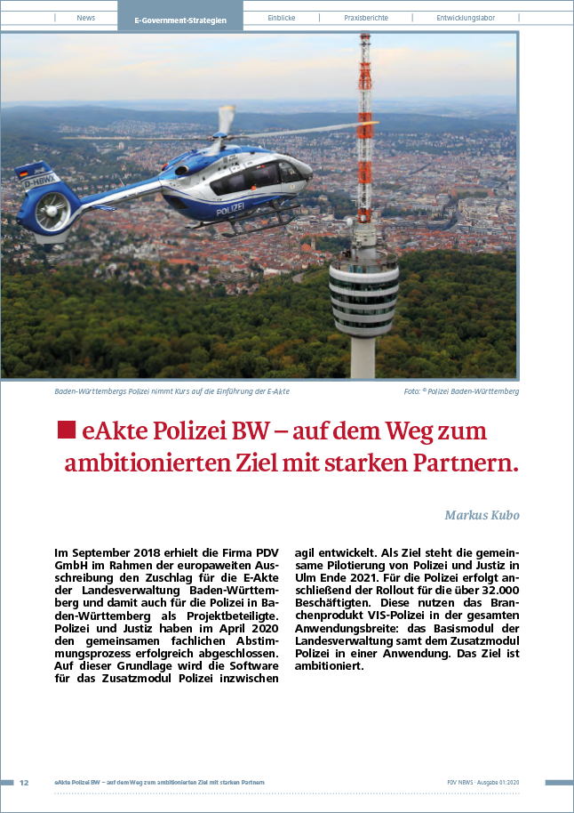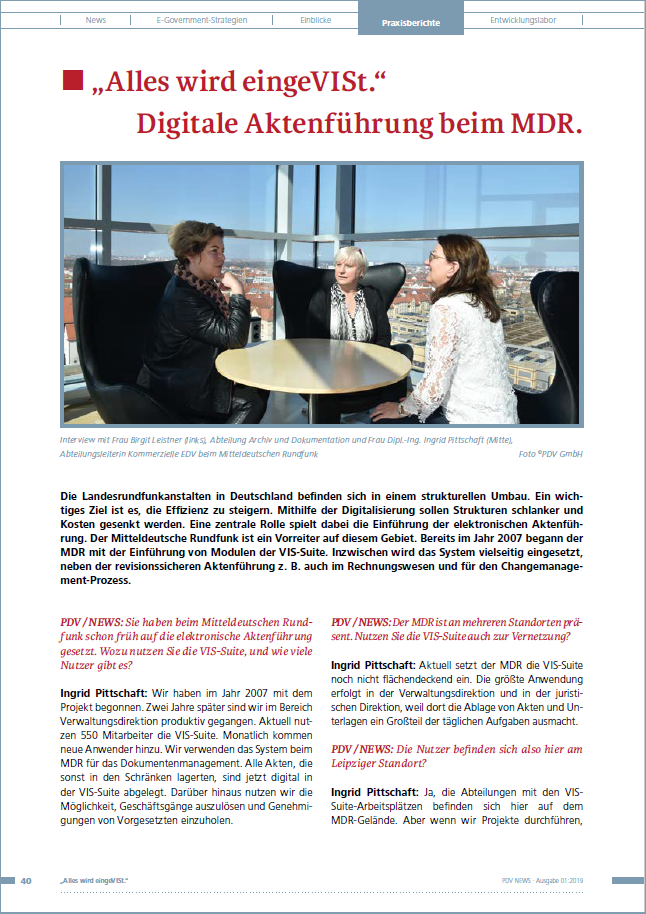 Der Erfahrungsaustausch zwischen Anwenderinnen und Anwendern der ECM-Plattform VIS-Suite und der PDV sowie die Mitwirkung der Kunden an der Weiterentwicklung von Produkten und Services sind wichtige Erfolgsfaktoren für unser Unternehmen. Lesen Sie Anwenderberichte der PDVNEWS, in denen Kunden von ihren Projekterfahrungen berichten. Erfahren Sie an praktischen Beispielen, wie eine ganzheitliche, digitale Aktenführung (E-Akte) verwirklicht werden kann und mit welchem Projektvorgehen Ihnen ein smarter Umstieg auf digitale Verwaltungsarbeit gelingt.